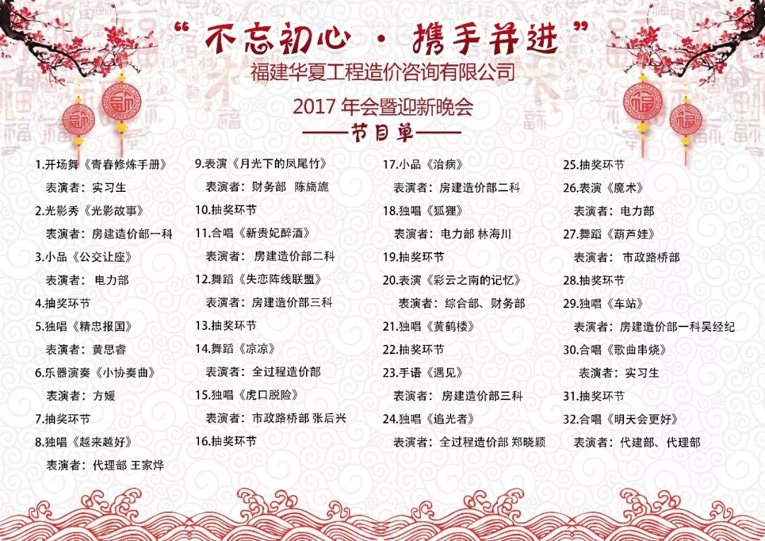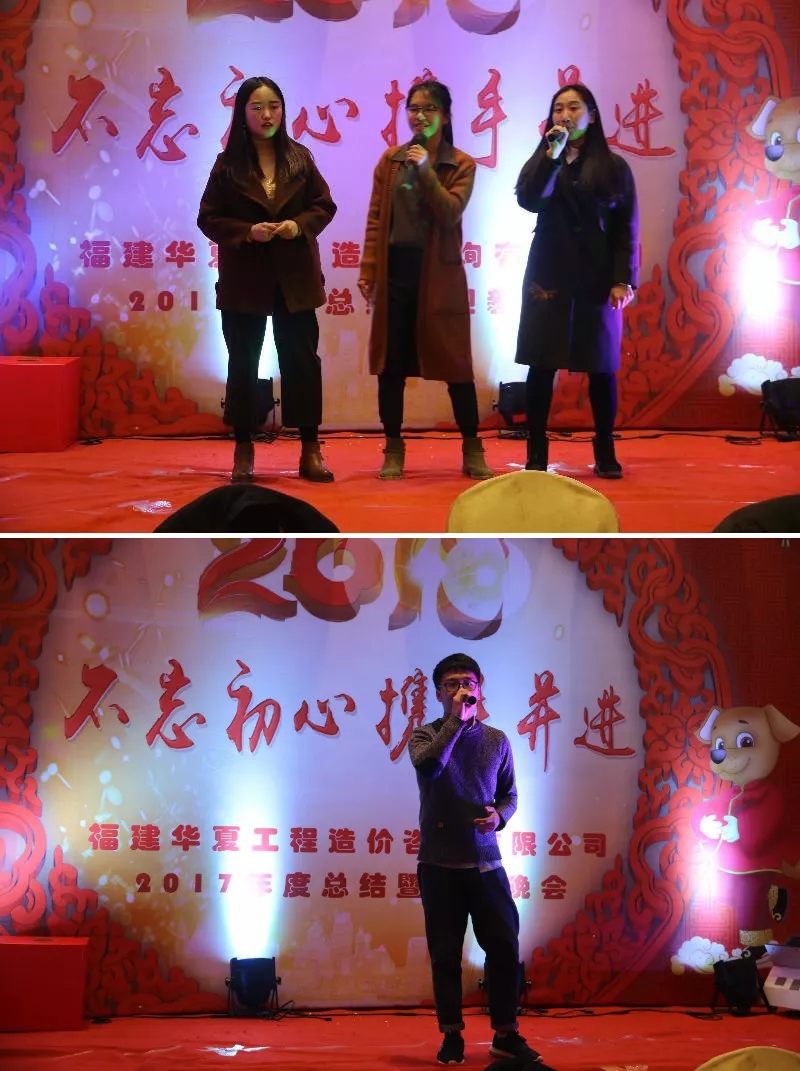 “不忘初心 携手并进 聚力华夏 共谱芳华”福建华夏工程造价咨询有限公司2017年会暨迎新晚会随着节目表演的进程而完美收官,各个科室团队纷纷上台合影留念,并纷纷彼此祝福。这场高质量、高水平、温馨又欢乐的年会不仅给大家带来了欢声笑语,同时让华夏团队们连接得更加紧密了,让大家对来年的工作树立了信心,更加干劲十足!